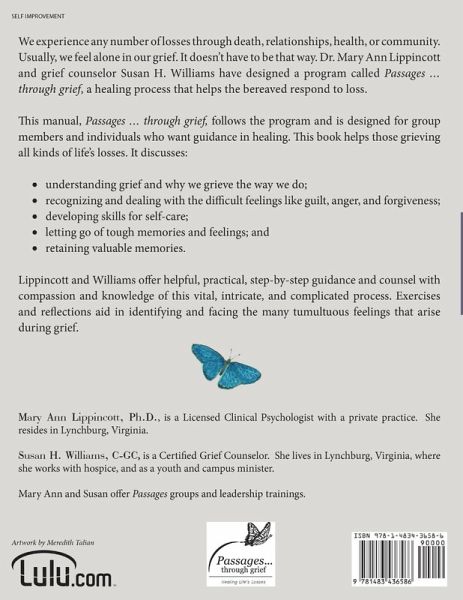 We experience any number of losses through death, relationships, health, or community. Usually, we feel alone in our grief. It doesn't have to be that way. Dr. Mary Ann Lippincott and grief counselor Susan H. Williams have designed a program called Passages ...through grief, a healing process that helps the bereaved respond to loss. This manual, Passages ... through grief, follows the program and is designed for group members and individuals who want guidance in healing. This book helps those grieving all kinds of life's losses. Lippincott and Williams offer helpful, practical, step-by-step guidance and counsel with compassion and knowledge of this vital, intricate, and complicated process. Exercises and reflections aid in identifying and facing the many tumultuous feelings that arise during grief.