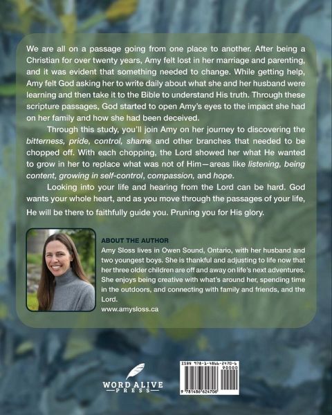 We are all on a passage going from one place to another. After being a Christian for over twenty years, Amy felt lost in her marriage and parenting, and it was evident that something needed to change. While getting help, Amy felt God asking her to write daily about what she and her husband were learning and then take it to the Bible to understand His truth. Through these scripture passages, God started to open Amy's eyes to the impact she had on her family and how she had been deceived. Through this study, you'll join Amy on her journey to discovering the bitterness, pride, control, shame and other branches that needed to be chopped off. With each chopping, the Lord showed her what He wanted to grow in her to replace what was not of Him--areas like listening, being content, growing in self-control, compassion, and hope. Looking into your life and hearing from the Lord can be hard. God wants your whole heart, and as you move through the passages of your life, He will be there to faithfully guide you. Pruning you for His glory.
