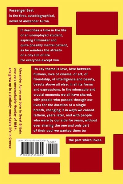 Passenger Seat is the first, autobiographical, novel of Alexander Auron. It describes a time in the life of an unemployed student, aspiring filmmaker and quite possibly mental patient, as he wanders the streets of a city full of life for everyone except him. Its key theme is love, love between humans, love of cinema, of art, of friendship, of intelligence and beauty, beauty above all else, in all its forms and expressions, in the minuscule and crucial moments we all have shared, with people who passed through our lives for the duration of a single breath, changing it in ways we cannot fathom, years later, and with people who were by our side for years, without ever sharing the one and only part of their soul we wanted them to: the part which loves.