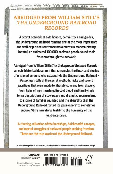 Discover a powerful collection of the hardships, hairbreadth escapes, and mortal struggles of enslaved people seeking freedom: These are the true stories of the Underground Railroad. A secret network of safe houses, committees and guides that stretched well below the Mason-Dixon Line into the brutal slave states of the American South, the Underground Railroad remains one of the most impressive and well-organised resistance movements in modern history. It facilitated the escape of over 30,000 slave 'passengers' through America and into Canada during its peak years of 1850-60, and, in total, an estimated 100,000 slaves found their freedom through the network. Abridged from William Still's The Underground Railroad Records - an epic historical document that chronicles the first-hand stories of American slaves who escaped to freedom via the Underground Railroad - Passengers tells of the secret methods, risks and covert sacrifices that were made to liberate so many from slavery. From tales of men murdered in cold blood for their part in helping assist runaways and terrifyingly tense descriptions of stowaways and dramatic escape plans, to stories of families reunited and the moments of absurdity that the Underground Railroad forced its 'passengers' to sometimes endure, Still's narratives testify to the humanity of this vast enterprise. WITH AN INTRODUCTION FROM TA-NEHISI COATES, AUTHOR OF THE WATER DANCER ABRIDGED FROM WILLIAM STILL'S THE UNDERGROUND RAILROAD RECORDS