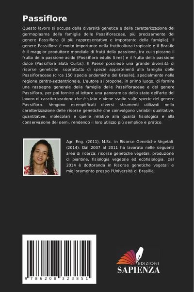 Questo lavoro si occupa della diversità genetica e della caratterizzazione del germoplasma della famiglia delle Passifloraceae, più precisamente del genere Passiflora (il più rappresentativo e importante della famiglia). Il genere Passiflora è molto importante nella frutticoltura tropicale e il Brasile è il maggior produttore mondiale di frutti della passione, tra cui spiccano il frutto della passione acido (Passiflora edulis Sims) e il frutto della passione dolce (Passiflora alata Curtis). Il Paese possiede una grande diversità di risorse genetiche, soprattutto di specie appartenenti alla famiglia delle Passifloraceae (circa 150 specie endemiche del Brasile), specialmente nella regione centro-settentrionale. L'autore si propone, in primo luogo, di fornire una rassegna generale della famiglia delle Passifloraceae e del genere Passiflora, per poi fornire al lettore una panoramica dello stato dell'arte del lavoro di caratterizzazione che è stato e viene svolto sulle specie del genere Passiflora. Vengono esemplificati diversi strumenti utilizzati nella caratterizzazione delle risorse genetiche che coinvolgono variabili qualitative, quantitative, molecolari e quelle relative alla qualità fisiologica e alla conservazione dei semi, rendendo il loro utilizzo più semplice e pratico.