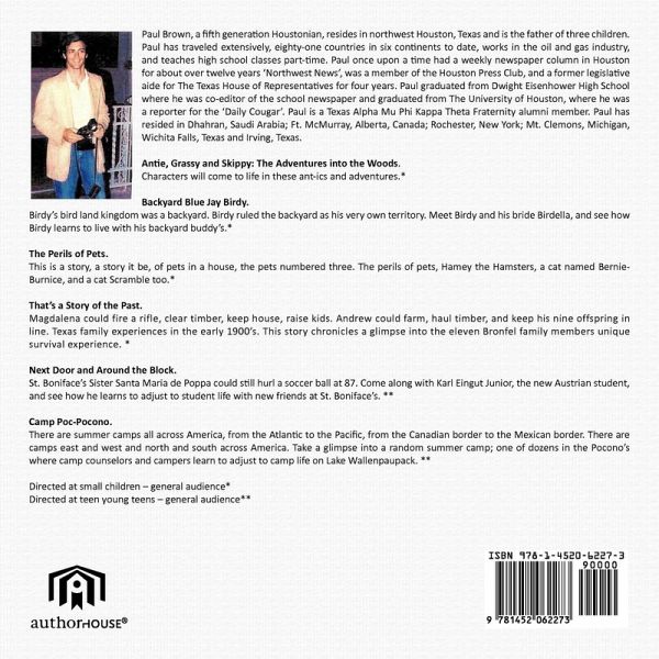 Antie, Grassy and Skippy: The Adventures into the Woods. Characters will come to life in these ant-ics and adventures.* Backyard Blue Jay Birdy. Birdy's bird land kingdom was a backyard. Birdy ruled the backyard as his very own territory. Meet Birdy and his bride Birdella, and see how Birdy learns to live with his backyard buddy's.* The Perils of Pets. This is a story, a story it be, of pets in a house, the pets numbered three. The perils of pets, Hamey the Hamsters, a cat named Bernie-Burnice, and a cat Scramble too.* That's a Story of the Past. Magdalena could fire a rifle, clear timber, keep house, raise kids. Andrew could farm, haul timber, and keep his nine offspring in line. Texas family experiences in the early 1900's. This story chronicles a glimpse into the eleven Bronfel family members unique survival experience. * Next Door and Around the Block. St. Boniface's Sister Santa Maria de Poppa could still hurl a soccer ball at 87. Come along with Karl Eingut Junior, the new Austrian student, and see how he learns to adjust to student life with new friends at St. Boniface's. ** Camp Poc-Pocono . There are summer camps all across America, from the Atlantic to the Pacific, from the Canadian border to the Mexican border. There are camps east and west and north and south across America. Take a glimpse into a random summer camp; one of dozens in the Pocono's where camp counselors and campers learn to adjust to camp life on Lake Wallenpaupack. ** Directed at small children - general audience* Directed at young teens - general audience**