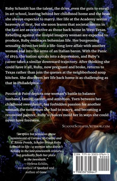 Formerly A Different Kind of Fire, Passion & Paint depicts one woman's battle to balance husband, family, career, and ambition. Torn between her childhood sweetheart, her forbidden passion for another woman, the nobleman she had to marry, and becoming a renowned painter, Ruby's choices mold her in ways she could never have foreseen. Ruby Schmidt has the talent, the drive, even the guts to enroll in art school, leaving behind her childhood home and the beau she always expected to marry. Her life at the Academy seems heavenly at first, but she soon learns that societal norms in the East are as restrictive as those back home in West Texas. Rebelling against the insipid imagery women are expected to produce, Ruby embraces bohemian life. Her burgeoning sexuality drives her into a life-long love affair with another woman and into the arms of an Italian baron. With the Panic of 1893, the nation spirals into a depression, and Ruby's career takes a similar downward trajectory. After thinking she could have it all, Ruby, now pregnant and broke, returns to Texas rather than join the queues at the neighborhood soup kitchen. She discovers her life back home is as challenging as that in Philadelphia.