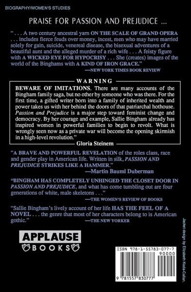"There are many accounts of the Bingham family saga, but no other by someone who was there. For the first time, a gifted writer born into a family of inherited wealth and power takes us with her behind the doors of that patriarchal hothouse. Passion and Prejudice is a major step toward feminist change and democracy. By her courage and example, Sallie Bingham already has inspired women in powerful families to begin to revolt. What is wrongly seen now as a private war will be come the opening skirmish in a high-level revolution." - Gloria Steinem