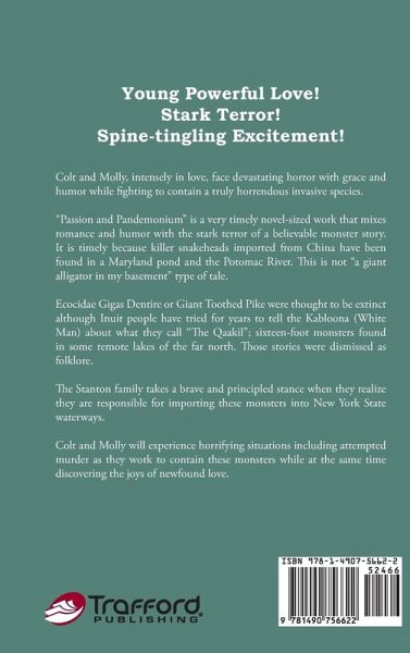 Colt and Molly, intensely in love, face devastating horror with grace and humor while fighting to contain a truly horrendous invasive species. "Passion and Pandemonium" is a very timely novel-sized work that mixes romance and humor with the stark terror of a believable monster story. It is timely because killer snakeheads imported from China have been found in a Maryland pond and the Potomac River. This is not "a giant alligator in my basement" type of tale. Ecocidae Gigas Dentire or Giant Toothed Pike were thought to be extinct although Inuit people have tried for years to tell the Kabloona (White Man) about what they call "The Qaakil"; sixteen-foot monsters found in some remote lakes of the far north. Those stories were dismissed as folklore. The Stanton family takes a brave and principled stance when they realize they are responsible for importing these monsters into New York State waterways. Colt and Molly will experience horrifying situations including attempted murder as they work to contain these monsters while at the same time discovering the joys of newfound love.