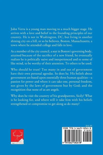 John Verra is a young man moving to a much bigger stage. He arrives with a love and belief in the founding principles of our country. He is not in Washington, DC, but living in another shinning city on a hill, or so he believes, Boston, Massachusetts, a town where he attended college and falls in love.As a member of the city council, a seat in Boston's governing body, attained because of the sacrifice of a new friend, he eventually realizes he is politically naive and inexperienced and to some of like mind, to be worthy of their attention. To others to be used.Who should he trust? Too many in and out of government have their own personal agendas. So does he. His beliefs about government are based upon essentially three human qualities--a passion for power and where it can take one, personal freedom, not given by the laws of government but by God; and the recognition that none of us are angels. Why does he visit the country of his grandparents, Sicily? What is he looking for, and where will it take him with his beliefs strengthened or compromise to get along as do many?
