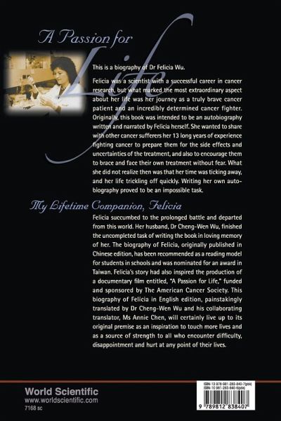 This is a biography of Dr Felicia Wu.Felicia was a scientist with a successful career in cancer research, but what marked the most extraordinary aspect about her life was her journey as a truly brave cancer patient and an incredibly determined cancer fighter. Originally, this book was intended to be an autobiography written and narrated by Felicia herself. She wanted to share with other cancer sufferers her 13 long years of experience fighting cancer to prepare them for the side effects and uncertainties of the treatment, and also to encourage them to brace and face their own treatment without fear. What she did not realize then was that her time was ticking away, and her life trickling off quickly. Writing her own autobiography proved to be an impossible task.Felicia succumbed to the prolonged battle and departed from this world. Her husband, Dr Cheng-Wen Wu, finished the uncompleted task of writing the book in loving memory of her. The biography of Felicia, originally published in Chinese edition, has been recommended as a reading model for students in schools and was nominated for an award in Taiwan. Felicia's story had also inspired the production of a documentary film entitled, ¿A Passion for Life,¿ funded and sponsored by The American Cancer Society. This biography of Felicia in English edition, painstakingly translated by Dr Cheng-Wen Wu and his collaborating translator, Ms Annie Chen, will certainly live up to its original premise as an inspiration to touch more lives and as a source of strength to all who encounter difficulty, disappointment and hurt at any point of their lives.
