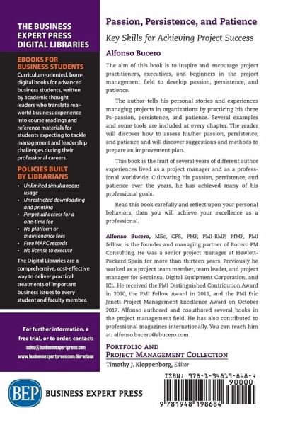 The aim of this book is to inspire and encourage project practitioners, executives, and beginners in the project management field to develop passion, persistence, and patience. The author tells his personal stories and experiences managing projects in organizations by practicing his three Ps-passion, persistence, and patience. Several examples and some tools are included at every chapter. The reader will discover how to assess his/her passion, persistence, and patience and will discover suggestions and methods to prepare an improvement plan. This book is the fruit of several years of different author experiences lived as a project manager and as a professional worldwide. Cultivating his passion, persistence, and patience over the years, he has achieved many of his professional goals. Read this book carefully and reflect upon your personal behaviors, then you will achieve your excellence as a professional.