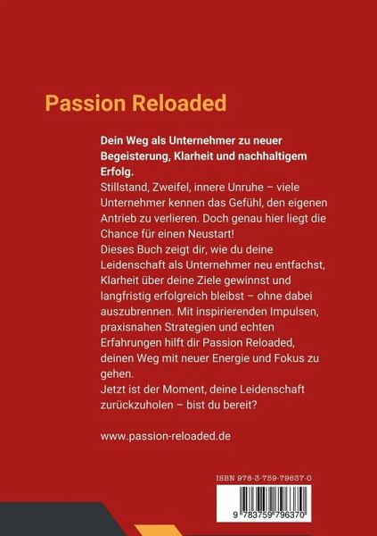 Viele Unternehmer verlieren im Laufe der Jahre die Begeisterung, mit der sie einst gestartet sind. Der Alltag wird zur Belastung, der Sinn verschwimmt, und die eigene Energie schwindet. "Passion Reloaded"lädt dazu ein, innezuhalten und neu zu entdecken, was wirklich trägt. Das Buch unterstützt Unternehmerinnen und Unternehmer dabei, Klarheit über ihre aktuelle Situation zu gewinnen, unbewusste Muster zu erkennen und den Mut zu fassen, neue Wege zu gehen - ohne gleich alles auf den Kopf zu stellen. Mit reflektierenden Fragen, inspirierenden Impulsen und praxisnahen Ansätzen zeigt René Greiner, wie man mit kleinen Schritten zu neuer Orientierung, Leichtigkeit und echter Erfüllung im Unternehmertum findet. Persönlich, ehrlich und auf Augenhöhe geschrieben, ist dieses Buch ein wertvoller Begleiter für alle, die wieder mit Freude und Sinn gestalten wollen - im Beruf und darüber hinaus.