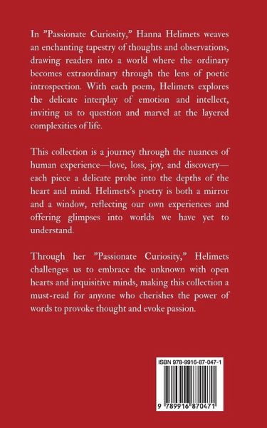 In "Passionate Curiosity," Hanna Helimets weaves an enchanting tapestry of thoughts and observations, drawing readers into a world where the ordinary becomes extraordinary through the lens of poetic introspection. With each poem, Helimets explores the delicate interplay of emotion and intellect, inviting us to question and marvel at the layered complexities of life. This collection is a journey through the nuances of human experience-love, loss, joy, and discovery-each piece a delicate probe into the depths of the heart and mind. Helimets's poetry is both a mirror and a window, reflecting our own experiences and offering glimpses into worlds we have yet to understand. Through her "Passionate Curiosity," Helimets challenges us to embrace the unknown with open hearts and inquisitive minds, making this collection a must-read for anyone who cherishes the power of words to provoke thought and evoke passion. Copyright © 2024 Book Fairy Publishing