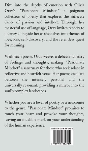 Dive into the depths of emotion with Olivia Orav's "Passionate Mindset," a poignant collection of poetry that explores the intricate dance of passion and intellect. Through her masterful use of language, Orav invites readers to journey alongside her as she delves into themes of love, loss, self-discovery, and the relentless quest for meaning. With each poem, Orav weaves a delicate tapestry of feelings and thoughts, making "Passionate Mindset" a sanctuary for those who seek solace in reflective and heartfelt verse. Her poems oscillate between the intensely personal and the universally resonant, providing a mirror into the soul's complex landscapes. Whether you are a lover of poetry or a newcomer to the genre, "Passionate Mindset" promises to touch your heart and provoke your thoughts, leaving an indelible mark on your understanding of the human experience. Copyright (c) 2024 Swan Charm Publishing