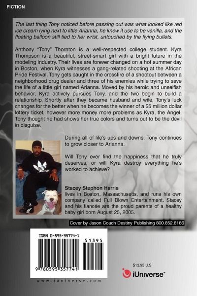 The last thing Tony noticed before passing out was what looked like red ice cream lying next to little Arianna, he knew it use to be vanilla, and the floating balloon still tied to her wrist, untouched by the flying bullets. Anthony 'Tony" Thornton is a well-respected college student. Kyra Thompson is a beautiful, street-smart girl with a bright future in the modeling industry. Their lives are forever changed on a hot summer day in Boston, when Kyra witnesses a gang-related shooting at the African Pride Festival. Tony gets caught in the crossfire of a shootout between a neighborhood drug dealer and three of his enemies while trying to save the life of a little girl named Arianna. Moved by his heroic and unselfish behavior, Kyra actively pursues Tony, and the two begin to build a relationship. Shortly after they became husband and wife, Tony's luck changes for the better when he becomes the winner of a $5 million dollar lottery ticket, however more money more problems as Kyra, the Angel, Tony thought he had shows her true colors and turns out to be the devil in disguise. During all of life's ups and downs, Tony continues to grow closer to Arianna. Will Tony ever find the happiness that he truly deserves, or will Kyra destroy everything he's worked to achieve?