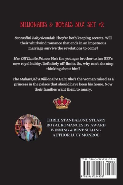 Three standalone, steamy, royal romances by USA Today bestselling author Lucy Monroe. Scorsolini Baby Scandal: They're both keeping secrets. Will their whirlwind romance that ends in an impetuous marriage survive the revelations to come? Her Off Limits Prince: He's the younger brother to her BFF's new royal hubby. Definitely off-limits. So, why can't she stop thinking about him? The Maharajah's Billionaire Heir: She's the woman raised as a princess in the palace that should have been his home. Now their families want them to marry.
