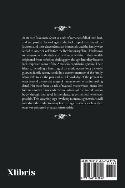 At its core Passionate Spirit is a tale of romance, full of love, lust, and yes, passion. It's told against the backdrop of the story of the Jacksons and their descendants, an immensely wealthy family who settled in America well before the Revolutionary War. Unbeknown to everyone outside their clan and most within it, their wealth originated from nefarious skulduggery, though later they became well-respected icons of the American capitalistic system. Their history, including a haunting of an erotic nature long a closely guarded family secret, is told by a current member of the family who's able to see the past and gain knowledge of the present in ways beyond the normal range of human senses, often in startling detail. Her main focus is a tale of two soul mates whose intense love for one another transcends the boundaries of the mortal human body, though they revel in the pleasures of the flesh whenever possible. This sweeping saga involving numerous generations will introduce the reader to many fascinating characters, each in their own way possessed of a passionate spirit.