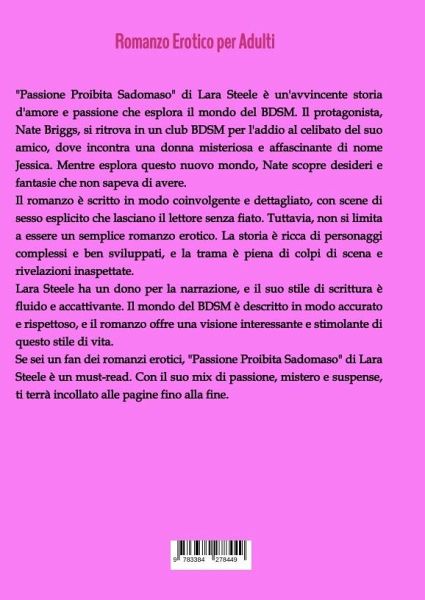 "Passione Proibita Sadomaso" di Lara Steele è un'avvincente storia d'amore e passione che esplora il mondo del BDSM. Il protagonista, Nate Briggs, si ritrova in un club BDSM per l'addio al celibato del suo amico, dove incontra una donna misteriosa e affascinante di nome Jessica. Mentre esplora questo nuovo mondo, Nate scopre desideri e fantasie che non sapeva di avere.Il romanzo è scritto in modo coinvolgente e dettagliato, con scene di sesso esplicito che lasciano il lettore senza fiato. Tuttavia, non si limita a essere un semplice romanzo erotico. La storia è ricca di personaggi complessi e ben sviluppati, e la trama è piena di colpi di scena e rivelazioni inaspettate.Lara Steele ha un dono per la narrazione, e il suo stile di scrittura è fluido e accattivante. Il mondo del BDSM è descritto in modo accurato e rispettoso, e il romanzo offre una visione interessante e stimolante di questo stile di vita.Se sei un fan dei romanzi erotici, "Passione Proibita Sadomaso" di Lara Steeleè un must-read. Con il suo mix di passione, mistero e suspense, ti terrà incollato alle pagine fino alla fine.