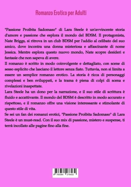 "Passione Proibita Sadomaso" di Lara Steele è un'avvincente storia d'amore e passione che esplora il mondo del BDSM. Il protagonista, Nate Briggs, si ritrova in un club BDSM per l'addio al celibato del suo amico, dove incontra una donna misteriosa e affascinante di nome Jessica. Mentre esplora questo nuovo mondo, Nate scopre desideri e fantasie che non sapeva di avere.Il romanzo è scritto in modo coinvolgente e dettagliato, con scene di sesso esplicito che lasciano il lettore senza fiato. Tuttavia, non si limita a essere un semplice romanzo erotico. La storia è ricca di personaggi complessi e ben sviluppati, e la trama è piena di colpi di scena e rivelazioni inaspettate.Lara Steele ha un dono per la narrazione, e il suo stile di scrittura è fluido e accattivante. Il mondo del BDSM è descritto in modo accurato e rispettoso, e il romanzo offre una visione interessante e stimolante di questo stile di vita.Se sei un fan dei romanzi erotici, "Passione Proibita Sadomaso" di Lara Steeleè un must-read. Con il suo mix di passione, mistero e suspense, ti terrà incollato alle pagine fino alla fine.