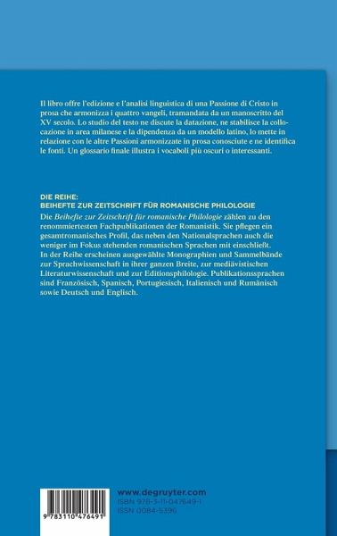 Il libro si propone come contributo a entrambi i campi. Per il primo versante, si offre un'edizione della Passione armonizzata in prosa tramandata dal manoscritto quattrocentesco Trivulziano 1993; il lavoro è corredato da un'analisi della lingua del testo, identificata come antico milanese e descritta partitamente nei suoi aspetti fonetici, morfologici, sintattici e lessicali. Per il secondo ambito di ricerca, si inquadra il testo del Trivulziano 1993 all'interno di un gruppo di volgarizzamenti in prosa di Passioni armonizzate, per lo più collocabili nell'Italia settentrionale, che erano finora sconosciuti o poco noti, evidenziandone i nessi e inserendoli nella tradizione del Diatessaron.