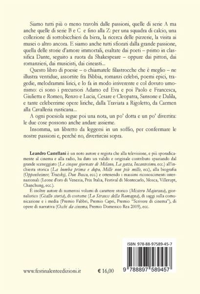 Le grandi storie d'amore raccontate in punta di penna. Siamo tutti più o meno travolti dalle passioni, quelle di serie A ma anche quelle di serie B e C e fino alla Z: passione per una squadra di calcio, una collezione di sottobicchieri da birra, la ricerca delle pizzerie, la visita ai musei o altro ancora. E siamo anche tutti sfiorati dalla grande passione, quella delle storie d'amore immortali, esaltate dai poeti - primo in classifica Dante, seguito a ruota da Shakespeare - oppure dai pittori, dai romanzieri, dai musicisti, dai cineasti... Questo libro di poesie - o chiamatele filastrocche che è meglio - ne illustra ventidue, assortite fra Bibbia, romanzi celebri, poemi epici, tragedie, melodrammi lirici, e lo fa in modo irriverente e col dovuto umorismo: ci sono i precursori Adamo ed Eva e poi Paolo e Francesca, Giulietta e Romeo, Renzo e Lucia, Cesare e Cleopatra, Sansone e Dalila, e tante celeberrime opere liriche, dalla Traviata a Rigoletto, da Carmen alla Cavalleria rusticana... A ogni poesiola segue poi una nota, un po' dotta e un po' divertita: le due cose possono anche andare assieme. Un libro da leggersi in un soffio per confermare le nostre passioni e, perché no, divertircisi sopra.