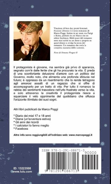 Vincitore di ben due premi letterari, Passioni Diverse è il terzo romanzo di Marco Poggi. Scritto in sei mesi, tra Parigi e Roma, periodo in cui Marco era un editor freelance. Molti passi del romanzo sono stati scritti su un treno e proprio su quest'ultimo si svolge la storia del romanzo. Un romanzo che svela la completa maturita' dello scrittore. La trama Il protagonista e' giovane, ma sembra gia' privo di speranza, segnato com'e' dalle ferite che gli ha procurato la vita. E' preda di una sconfortante delusione d'amore con un politico del Governo, molto noto, che alimenta una profonda sfiducia nel futuro; e' oppresso da un risentimento che lo rende tetragono agli amorosi assalti di un ragazzo che si offre di accompagnarlo per un tratto di vita. Per tutto il romanzo la rabbia dei sentimenti trascolora nell'urlo frustrato verso la vita, e solo attraverso la creatività il protagonista riesce a squarciare il velo opprimente del quotidiano che offusca l'orizzonte illimitato dei suoi sogni.