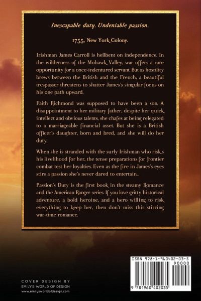 Inescapable duty. Undeniable passion. 1755, New York Colony Irishman James Carroll is hellbent on independence. In the wilderness of the Mohawk Valley, war offers a rare opportunity for a once-indentured servant. But as hostility brews between the British and the French, a beautiful trespasser threatens to shatter James's singular focus on his one path upward. Faith Richmond was supposed to have been a son. A disappointment to her military father, despite her quick intellect and obvious talents, she chafes at being relegated to life as a marriageable financial asset. Stranded with the surly Irishman who risks his livelihood for her, the tense preparations for frontier combat test her loyalties. Even as the fire in James's eyes stirs a passion she's never dared entertain...until now. Passion's Duty is the first book in the steamy Romance and the American Ranger series. If you love gritty historical adventure, a bold heroine, and a hero willing to risk everything to keep her, then don't miss this stirring wartime romance. Grab your copy to be swept up in their passionate journey today!
