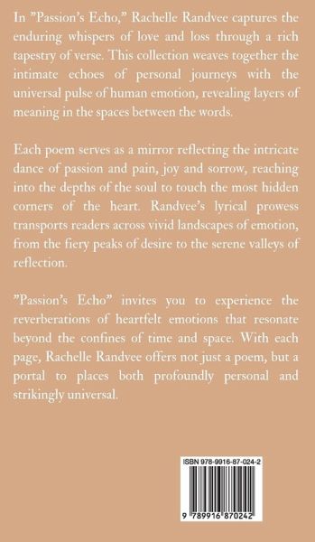 In "Passion's Echo," Rachelle Randvee captures the enduring whispers of love and loss through a rich tapestry of verse. This collection weaves together the intimate echoes of personal journeys with the universal pulse of human emotion, revealing layers of meaning in the spaces between the words. Each poem serves as a mirror reflecting the intricate dance of passion and pain, joy and sorrow, reaching into the depths of the soul to touch the most hidden corners of the heart. Randvee's lyrical prowess transports readers across vivid landscapes of emotion, from the fiery peaks of desire to the serene valleys of reflection. "Passion's Echo" invites you to experience the reverberations of heartfelt emotions that resonate beyond the confines of time and space. With each page, Rachelle Randvee offers not just a poem, but a portal to places both profoundly personal and strikingly universal. Copyright © 2024 Book Fairy Publishing