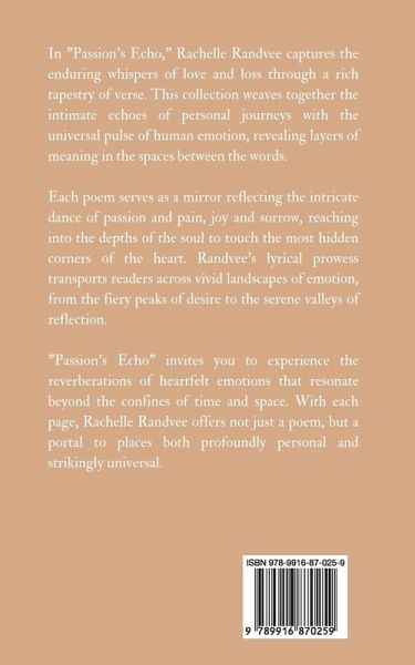 In "Passion's Echo," Rachelle Randvee captures the enduring whispers of love and loss through a rich tapestry of verse. This collection weaves together the intimate echoes of personal journeys with the universal pulse of human emotion, revealing layers of meaning in the spaces between the words. Each poem serves as a mirror reflecting the intricate dance of passion and pain, joy and sorrow, reaching into the depths of the soul to touch the most hidden corners of the heart. Randvee's lyrical prowess transports readers across vivid landscapes of emotion, from the fiery peaks of desire to the serene valleys of reflection. "Passion's Echo" invites you to experience the reverberations of heartfelt emotions that resonate beyond the confines of time and space. With each page, Rachelle Randvee offers not just a poem, but a portal to places both profoundly personal and strikingly universal. Copyright © 2024 Book Fairy Publishing