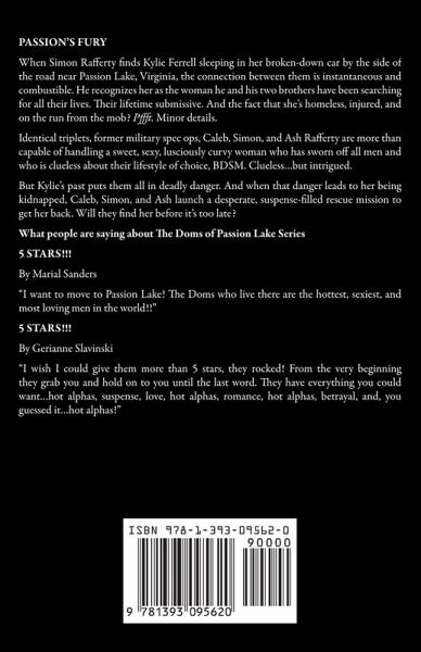 PASSION'S FURY When Simon Rafferty finds Kylie Ferrell sleeping in her broken-down car by the side of the road near Passion Lake, Virginia, the connection between them is instantaneous and combustible. He recognizes her as the woman he and his two brothers have been searching for all their lives. Their lifetime submissive. And the fact that she's homeless, injured, and on the run from the mob? Pffft. Minor details. Identical triplets, former military spec ops, Caleb, Simon, and Ash Rafferty are more than capable of handling a sweet, sexy, lusciously curvy woman who has sworn off all men and who is clueless about their lifestyle of choice, BDSM. Clueless...but intrigued. But Kylie's past puts them all in deadly danger. And when that danger leads to her being kidnapped, Caleb, Simon, and Ash launch a desperate, suspense-filled rescue mission to get her back. Will they find her before it's too late? WHAT PEOPLE ARE SAYING ABOUT THE DOMS OF PASSION LAKE SERIES 5 STARS!!! By Marial Sanders "I want to move to Passion Lake! The Doms who live there are the hottest, sexiest, and most loving men in the world!!" 5 STARS!!! By Gerianne Slavinski "I wish I could give them more than 5 stars, they rocked! From the very beginning they grab you and hold on to you until the last word. They have everything you could want...hot alphas, suspense, love, hot alphas, romance, hot alphas, betrayal, and, you guessed it...hot alphas!"