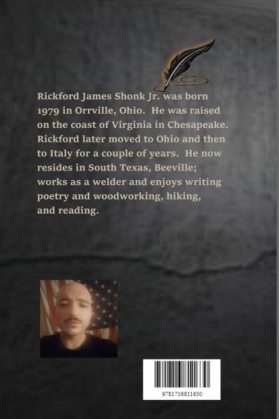 Rickford James Shonk Jr. was born 1979 in Orrville, Ohio. He was raised on the coast of Virginia in Chesapeake. Rickford later moved to Ohio and then to Italy for a couple of years. He now resides in South Texas, Beeville; works as a welder and enjoys writing poetry and woodworking, hiking, and reading.