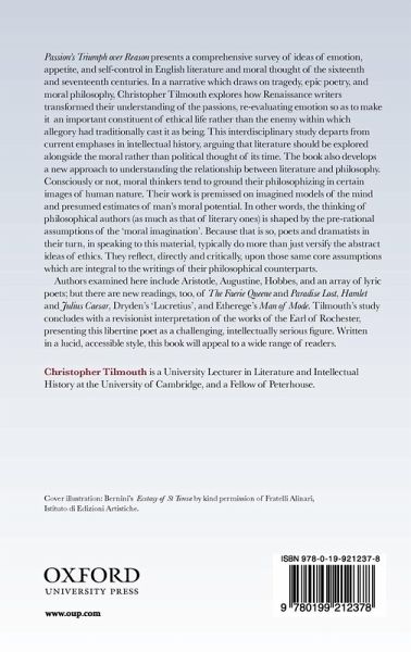 Passion's Triumph over Reason presents a comprehensive survey of ideas of emotion, appetite, and self-control in English literature and moral thought of the sixteenth and seventeenth centuries. In a narrative which draws on tragedy, epic poetry, and moral philosophy, Christopher Tilmouth explores how Renaissance writers transformed their understanding of the passions, re-evaluating emotion so as to make it an important constituent of ethical life rather than the enemy within which allegory had traditionally cast it as being. This interdisciplinary study departs from current emphases in intellectual history, arguing that literature should be explored alongside the moral rather than political thought of its time. The book also develops a new approach to understanding the relationship between literature and philosophy. Consciously or not, moral thinkers tend to ground their philosophising in certain images of human nature. Their work is premissed on imagined models of the mind and presumed estimates of man's moral potential. In other words, the thinking of philosophical authors (as much as that of literary ones) is shaped by the pre-rational assumptions of the 'moral imagination'. Because that is so, poets and dramatists in their turn, in speaking to this material, typically do more than just versify the abstract ideas of ethics. They reflect, directly and critically, upon those same core assumptions which are integral to the writings of their philosophical counterparts. Authors examined here include Aristotle, Augustine, Hobbes, and an array of lyric poets; but there are new readings, too, of The Faerie Queene and Paradise Lost, Hamlet and Julius Caesar, Dryden's 'Lucretius', and Etherege's Man of Mode. Tilmouth's study concludes with a revisionist interpretation of the works of the Earl of Rochester, presenting this libertine poet as a challenging, intellectually serious figure. Written in a lucid, accessible style, this book will appeal to a wide range of readers.
