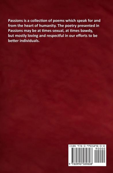 Passions, is a collection of Susan Patterson's poems which speak for and from the heart of humanity. The poetry presented in Passions may be at times sexual, at times bawdy, but mostly loving and respectful in our efforts to be better individuals.