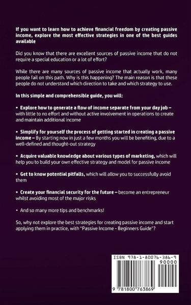 If you want to learn how to achieve financial freedom by creating passive income, explore the most effective strategies in one of the best guides available Did you know that there are excellent sources of passive income that do not require special education or a lot of effort?While there are many sources of passive income that actually work, many people fail on this path. Why is this happening? The main reason is that these people do not understand which direction to take and which strategy to use. In this simple and comprehensible guide, you will:Explore how to generate a flow of income separate from your day job - with little to no effort and without active involvement in operations to create and maintain additional income Simplify for yourself the process of getting started in creating a passive income - By starting now in just a few months you will be benefiting, due to a well-defined and thought-out strategy Acquire valuable knowledge about various types of marketing, which will help you to build your own effective strategy and model for passive income Get to know potential pitfalls, which will allow you to successfully avoid them Create your financial security for the future - become an entrepreneur whilst avoiding most of the major risks And so many more tips and benchmarks! ¿So, why not explore the best strategies for creating passive income and start applying them in practice, with "Passive Income - Beginners Guide"?So what are you waiting for?