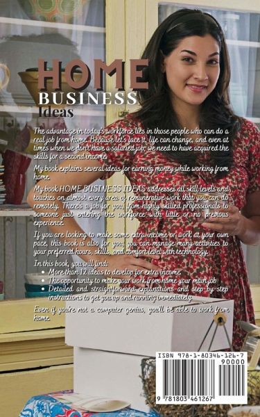 ARE YOU TIRED OF TRAVELLING MILES TO WORK? DO YOU WANT TO CREATE AN INCOME FROM HOME? The advantage in today's workforce lies in those people who can do a real job from home. Because let's face it, life can change, and even at times when we don't have a salaried job, we need to have acquired the skills for a second income. My book explains several ideas for earning money while working from home. My book HOME BUSINESS IDEAS addresses all skill levels and touches on almost every area of remunerative work that you can do remotely. There's a job for you, from highly skilled professionals to someone just entering the workforce with little or no previous experience. If you are looking to make some extra income or work at your own pace, this book is also for you; you can manage many activities to your preferred hours, skills, and comfort level with technology. In this book, you will find:More than 12 ideas to develop for extra income. The opportunity to make your work from home your main job Detailed and straightforward explanations and step-by-step instructions to get you up and running immediately Even if you're not a computer genius, you'll be able to work from home. Don't believe it? Buy HOME-BUSINESS IDEAS and try it out to see how easy it is to earn money from home.