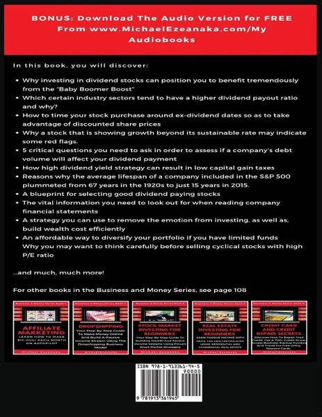 According to CNBC, the vast majority of Americans have under $1,000 saved and half of all Americans have nothing at all put away for retirement...dare to be different! Have you always wanted to invest in the stock market and earn passive income with dividend stocks? What would you be able to achieve with a step-by-step guide designed to help you grow your money, navigate the dangers in the stock market and minimize the chance of losing your capital? Imagine having the time, money and freedom to pursue things you're passionate about, whether it's gardening, hiking, reading, restoring a classic car or simply spending time with your loved ones. This book can help you can create this lifestyle for yourself and your loved ones! Amazon bestselling author, Michael Ezeanaka, takes you through a proven system that'll show you how to find good dividend stocks to invest in, when to buy, when to sell, which sectors perform the best, and how to make money with dividend stocks! In this book, you'll discover: Why investing in dividend stocks can position you to benefit tremendously from the "Baby Boomer Boost" (Chapter 1) Which certain industry sectors tend to have a higher dividend payout ratio and why? (Chapter 2) How to time your stock purchase around ex-dividend dates so as to take advantage of discounted share prices (Chapter 2) Why a stock that is showing growth beyond its sustainable rate may indicate some red flags. (Chapter 2) 5 critical questions you need to ask in order to assess if a company’s debt volume will affect your dividend payment (Chapter 3) How high dividend yield strategy can result in low capital gain taxes (Chapter 4) Reasons why the average lifespan of a company included in the S&P 500 plummeted from 67 years in the 1920s to just 15 years in 2015. (Chapter 5) A blueprint for selecting good dividend paying stocks (Chapter 6) The vital information you need to look out for when reading company financial statements (Chapter 7) A strategy you can use to remove the emotion from investing, as well as, build wealth cost efficiently (Chapter 8) An affordable way to diversify your portfolio if you have limited funds (Chapter 9) Why you may want to think carefully before selling cyclical stocks with high P/E ratio (Chapter 10) ... and much, much more! Whether you're a student, corporate executive, entrepreneur, or stay-at-home parent, the tactics described in this book can set the stage for a financial transformation. If you're ready to build and grow a steady stream of passive dividend income for your retirement, Grab your copy of this book today! Scroll to the top of the page and click the "BUY NOW" button!