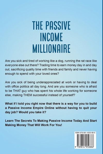 Learn The Secrets To Making Passive Income Today And Start Making Money That Will Work For You! Are you sick and tired of working like a dog, running the rat race like everyone else out there? Trading time to earn money day in and day out, sacrificing quality time with friends and family and never having enough to spend with your loved ones? Are you sick of being underappreciated at work or having to deal with office politics all day long. And are you someone who is afraid to be THAT guy who has spent his whole life working for someone else, making THEM successful instead of yourself? What if I told you right now that there is a way for you to build a Passive Income Empire Online without having to quit your day job? Would you take it? In This Book You Will Learn: 15 Profitable Sources To Build Online Passive Income Streams Specific Strategies On How To Grow The Businesses Build Profitable and High-Income Generating Blogs Building A Business Empire And Selling With FBA How to set up a membership website How to make money selling Ebooks on the Amazon Kindle Store How To Set Up A Profitable Youtube Channel How To Build Passive Income From Selling Ebooks How To Build Profitable And High Income Generating Blogs How To Monetize Selling Apps How To Invest In Real Estate Property How To Invest In Stocks, Bonds, & Annuities How To Build, Buy, & Flip Websites And Domains Outcomes Of Building Passive Income Online: Be able to travel the world Fulfill your dreams Have Financial Security Be Financially Stress-Free Buy Anything You Want Anytime In order to be THAT guy that everyone is envious of, you will need to start building a passive income business online TODAY. It takes time to grow a business from scratch and this book will provide you the exact steps you will need to take to begin that journey. You are going to get all these amazing strategies detailed out perfectly for you step by step. With all this knowledge at your fingertips would you take the leap of faith and become someone who is Financially Free who has Passive Income flowing into their pockets every single day? Someone who is retired before the age of 40 and has the time freedom to live life to the fullest with their most loved ones? Passive Income will liberate you from the cycle of scarcity, inadequacy and a life filled with compromises. Click on the BUY NOW button above to make that decision to break free from that cycle!