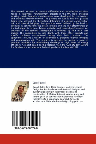 This research focusses on practical difficulties and cost-effective solutions found in Passivhaus refurbishment projects in the UK. From analysing working details bespoke questionnaires were developed for contractors and architects directly involved. The primary aim was to find best practice taking into account the theoretical difficulties of assessing condensation risk and thermal bridging. Best practices were defined by the level of difficulty in constructing the detail solution and the cost-effectiveness of the techniques in terms of labour, materials and thermal performance. An overview of the technical background is followed by four main case studies. The appendices go into depth with three other projects and specific problems encountered during their build processes. The appendices include a wealth of information, exploring thermal bridging and condensation risk. The research is intended to provide a sense of practical possibility for refurbishing dwellings to high levels of energy efficiency. A report based on this research won the CIAT Student Award for Excellence in Architectural Technology (Technical Report) 2012.