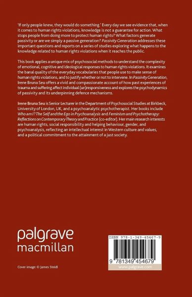 The book applies a unique mix of psychosocial methods to understand the complexity of emotional, cognitive and ideological responses to human rights violations and examines the banal quality of the everyday vocabularies that people use to make sense of human rights and their violations, and justify not intervening. In Passivity Generation , Irene Bruna Seu offers a vivid and compassionate account of how past experiences of trauma and suffering affect individual (un)responsiveness, and explores the psychodynamics of passivity and its underpinning defence mechanisms.