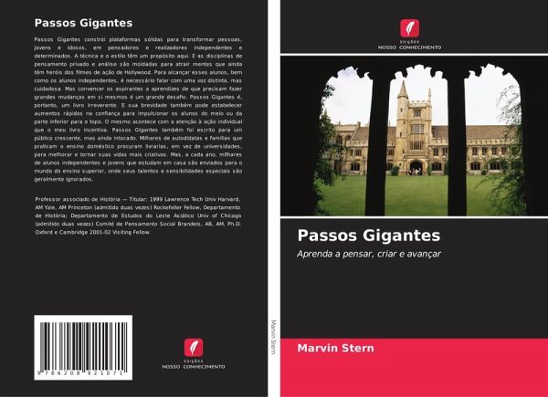 Passos Gigantes constrói plataformas sólidas para transformar pessoas, jovens e idosos, em pensadores e realizadores independentes e determinados. A técnica e o estilo têm um propósito aqui. E as disciplinas de pensamento privado e análise são moldadas para atrair mentes que ainda têm heróis dos filmes de ação de Hollywood. Para alcançar esses alunos, bem como os alunos independentes, é necessário falar com uma voz distinta, mas cuidadosa. Mas convencer os aspirantes a aprendizes de que precisam fazer grandes mudanças em si mesmos é um grande desafio. Passos Gigantes é, portanto, um livro irreverente. E sua brevidade também pode estabelecer aumentos rápidos na confiança para impulsionar os alunos do meio ou da parte inferior para o topo. O mesmo acontece com a atenção à ação individual que o meu livro incentiva. Passos Gigantes também foi escrito para um público crescente, mas ainda intocado. Milhares de autodidatas e famílias que praticam o ensino doméstico procuram livrarias, em vez de universidades, para melhorar e tornar suas vidas mais criativas. Mas, a cada ano, milhares de alunos independentes e jovens que estudam em casa são enviados para o mundo do ensino superior, onde seus talentos e sensibilidades especiais são geralmente ignorados.