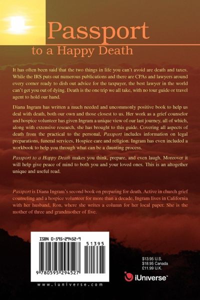 It has often been said that the two things in life you can't avoid are death and taxes. While the IRS puts out numerous publications and there are CPAs and lawyers around every corner ready to dish out advice for the taxpayer, the best lawyer in the world can't get you out of dying. Death is the one trip we all take, with no tour guide or travel agent to hold our hand. Diana Ingram has written a much needed and uncommonly positive book to help us deal with death, both our own and those closest to us. Her work as a grief counselor and hospice volunteer has given Ingram a unique view of our last journey, all of which, along with extensive research, she has brought to this guide. Covering all aspects of death from the practical to the personal, Passport includes information on legal preparations, funeral services, Hospice care and religion. Ingram has even included a workbook to help you through what can be a daunting process. Passport to a Happy Death makes you think, prepare, and even laugh. Moreover it will help give peace of mind to both you and your loved ones. This is an altogether unique and useful read.