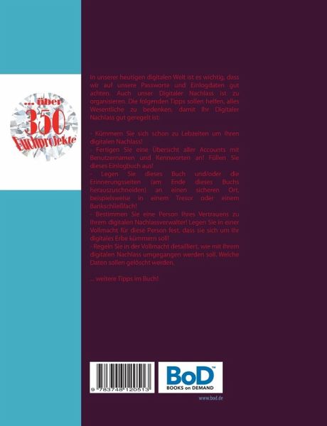 In unserer heutigen digitalen Welt ist es wichtig, dass wir auf unsere Passworte und Einlogdaten gut achten. Auch unser Digitaler Nachlass ist zu organisieren. Die folgenden Tipps sollen helfen, alles Wesentliche zu bedenken, damit Ihr Digitaler Nachlass gut geregelt ist:- Kümmern Sie sich schon zu Lebzeiten um Ihren digitalen Nachlass!- Fertigen Sie eine Übersicht aller Accounts mit Benutzernamen und Kennworten an! Füllen Sie dieses Einlogbuch aus!- Legen Sie dieses Buch und/oder die Erinnerungsseiten (am Ende dieses Buchs herauszuschneiden) an einen sicheren Ort, beispielsweise in einem Tresor oder einem Bankschließfach!- Bestimmen Sie eine Person Ihres Vertrauens zu Ihrem digitalen Nachlassverwalter! Legen Sie in einer Vollmacht für diese Person fest, dass sie sich um Ihr digitales Erbe kümmern soll!- Regeln Sie in der Vollmacht detailliert, wie mit Ihrem digitalen Nachlass umgegangen werden soll. Welche Daten sollen gelöscht werden. Wie soll die Vertrauensperson mit Ihrem Account, z.B. in einem sozialen Netzwerk, usw., umgehen und was mit im Netz vorhandenen Fotos passieren soll!- Bestimmen Sie ebenfalls, was mit Ihren Endgeräten (Computer, Smartphone, Tablet, Festplatten, usw.) und den dort gespeicherten Daten geschehen soll!- Die Vollmacht müssen Sie handschriftlich verfassen, mit einem Datum versehen und unterschreiben. Unabdingbar ist außerdem, dass sie "über den Tod hinaus" gilt. Am Ende dieses Buchs sind Vordrucke zu finden.- Denken Sie daran, die Auflistung Ihrer Accounts immer aktuell zu halten! Ergänzen Sie die Auflistung um neue Accounts, löschen Sie die Daten in der Übersicht, wenn Sie sich bei einem Account abgemeldet haben!SEITEN AM BUCHENDE BEACHTEN UND AUSSCHNEIDEN!