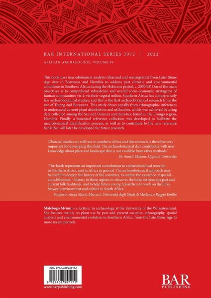 This book uses macrobotanical analysis (charcoal and seeds/grains) from Later Stone Age sites in Botswana and Namibia to address past climatic and environmental conditions in Southern Africa during the Holocene period, c. 2000 BP. One of its main objectives is to comprehend subsistence and overall socio-economic stratagems of human communities vis-à-vis their vegetal milieu. The majority of Southern Africa has comparatively few archaeobotanical studies, so this is the first archaeobotanical research from the site of Toteng and Botswana. Hence, this study draws equally from ethnographic inferences to understand current plant distribution and utilisation, which was achieved by using data collected among the San and Damara communities, found in the Erongo region, Namibia. Finally, a botanical reference collection was developed in order to facilitate the macrobotanical identification process, as well as to contribute to the initial reference bank that will later be developed for future research.