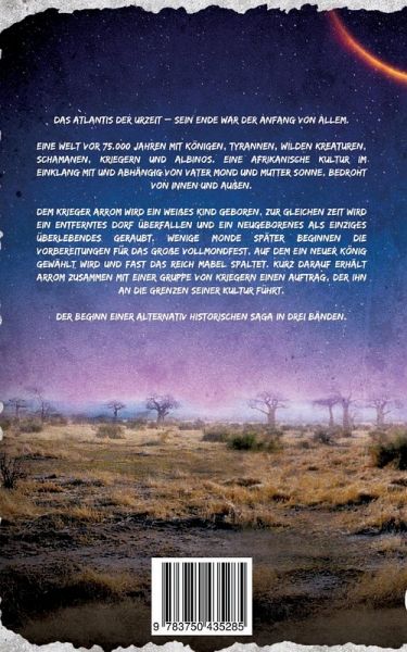 Das Atlantis der Urzeit - sein Ende war der Anfang von allem. Eine Welt vor 75.000 Jahren mit Königen, Tyrannen, wilden Kreaturen, Schamanen, Kriegern und Albinos. Eine afrikanische Kultur im Einklang mit und abhängig von Vater Mond und Mutter Sonne, bedroht von innen und außen. Dem Krieger Arrom wird ein weißes Kind geboren, zur gleichen Zeit wird ein entferntes Dorf überfallen und ein Neugeborenes als einziges Überlebendes geraubt. Wenige Monde später beginnen die Vorbereitungen für das große Vollmondfest, auf dem ein neuer König gewählt wird und fast das Reich Mabel spaltet. Kurz darauf erhält Arrom zusammen mit einer Gruppe von Kriegern einen Auftrag, der ihn an die Grenzen seiner Kultur führt. Der Beginn einer alternativ historischen Saga in drei Bänden.