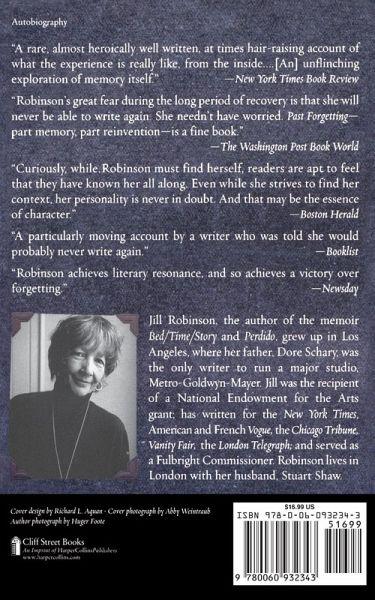 A love story, a mystery, and a memory guide, Past Forgetting shows a writer's determination to re-create her life.Jill Robinson, novelist and author of Bed/Time/Story, wakes from a coma to discover she's lost her memory and just about any sense of who she was.And is. She likes the look of the man standing next to her bed, but doesn't recognize that he's her husband, Stuart. What matters is that she feels safe around him. As she searches the house for her children, she is reminded that her son and daughter are both grown with families of their own--how well did she ever know them? Can You make up for a past you don't really remember? It is Stuart who begins to fill in the details for Jill, including the fact that she's a well-known writer, although when she meets with her doctors, they say she may never write again. Against all odds, Jill Robinson retrieved her unique writing voice, and in this engaging memoir shows how she does it. She takes us with her on her exploration of'tlie connections between memory and creativity, celebrity and anonymity, and loss and discovery. From her first tentative steps outside her house on Wimpole Street to London's sleek West End. From a trip to Oxford to discuss memory with a professor to her amazing voyage to Los Angeles on an assignment for Vanity fair which takes her back to the sixties world of Hockney, Polanski, and Hopper, Jill forges new paths to memory. In Past Forgetting, Jill Robinson rediscovers friendships she doesn't know she had: Robert Redford tells her stories about her childhood; at John Lahr's London literary teas, she's reintroduced to the writer's world, and Cary Grant offers her memories of her father, Dore Schary. And being with Barbra Streisand reminds her of a time she doesn't quite remember: when her father was running MGM. In her urgent voyage to redefine herself, Jill asks all the questions you've ever asked on the nature of memory. Is recollection shadowed by emotion? Is memory an act of reinvention? Do people reinvent rather than recollect? In Past Forgetting you'll find the answers and you'll meet a writer you won't want to forget.