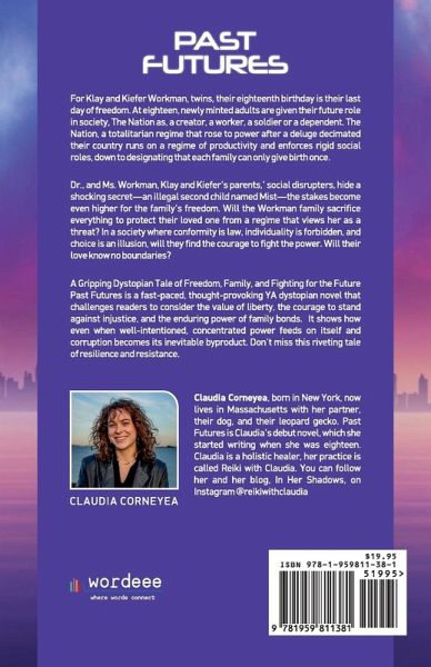 For the Workman twins, Klay, and Kiefer, their eighteenth birthday is their last day of freedom. At eighteen, now considered productive, citizens are given their future role in society as Creator, Worker, Soldier, or Dependent. The Nation, a totalitarian regime that rose to power after the worst climate crisis in human history, depends on a system of productivity while enforcing rigid social roles, down to limiting each family to giving birth once. Klay and Kiefer's parents hide a shocking secret¿an illegal third child named Mist, making the stakes even higher for the family. Will the Workmans sacrifice everything to protect Mist from a regime that views her as a threat? In a society where conformity is law, individuality is forbidden, and choice is an illusion, will they find the courage to fight for their freedom? Will their love know no boundaries? A gripping dystopian tale of freedom, family, and fighting for a better future, Past Futures is a fast-paced, thought-provoking YA dystopian novel that challenges readers to consider the value of liberty, the courage it takes to stand up against injustice, and the enduring power of family bonds. It shows how even when well-intentioned, concentrated power feeds on itself, corruption becomes its inevitable byproduct. Don't miss out on this riveting tale of resilience and resistance.
