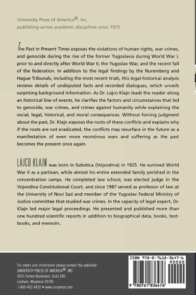 The Past in Present Times exposes the violations of human rights, war crimes, and genocide during the rise of the former Yugoslavia during World War I, prior to and directly after World War II, the Yugoslav War, and the recent fall of the federation. In addition to the legal findings by the Nuremberg and Hague Tribunals, including the most recent trials, this legal-historical analysis reviews details of undisputed facts and recorded dialogues, which unveils surprising background information. As Dr. Lajco Klajn leads the reader along an historical line of events, he clarifies the factors and circumstances that led to genocide, war crimes, and crimes against humanity while explaining the social, legal, historical, and moral consequences. Without forcing judgment about the past, Dr. Klajn exposes the roots of these conflicts and explains why if the roots are not eradicated, the conflicts may resurface in the future as a manifestation of even more monstrous wars and suffering as the past becomes the present once again.