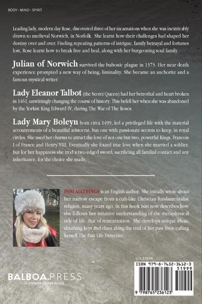 Rose had been on an exciting personal journey of spiritual emergence, since leaving organised religion. Her intriguing stories are narrated by her chosen muse, English medieval mystic and anchorite, Julian of Norwich in Norfolk. After a spiritual journey with a shaman, Rose discovered a mystical set of keys, opening doors to exciting synchronicities between her present and past lives. Based on the principles of reincarnation, Rose finds the magic we can each weave, on our enlightenment journey. Her blossoming comprehension of clues, revealed others in the picture that was building. She began to develop her own methods of discovery, reinventing herself The Past Life Detective. Using birthdays, number synchronicities, location and character similarities, she shone new light on the deeper meaning of traumatic events she had experienced. These had greatly impacted, leaving a painful trail in both her current life and of those whose lives were intertwined with hers, past and present. Rose slowly began to see her challenging life experiences, through a more compassionate lens. It became necessary for her to fully forgive and release. As her own past life characters emerged, she discovered a special soul group, who met with her on this past life journey, in various ways. Mysterious patterns led her on a metaphysical pilgrimage. It all began when she moved to the medieval city of Norwich in East Anglia. Rose stumbled upon colourful characters such as Julian of Norwich, Lady Eleanor Talbot and Mary Boleyn, who gradually came to life for her. As the mystical keys unlocked clues, each synchronicity she experienced, revealed another piece of the puzzle. Isisi found that there were repeating themes of abandonment, betrayal and loss. She developed the blueprint for a releasing protocol. It lead her and her growing soul family, towards a deep healing of the heart, mind and soul.