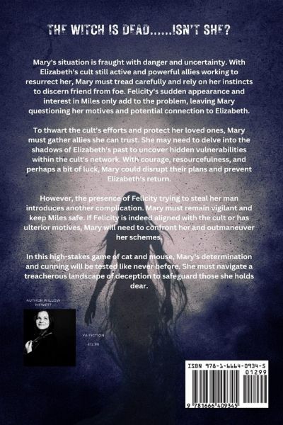 The witch is dead...isn't she? Mary's situation is fraught with danger and uncertainty. With Elizabeth's cult still active and powerful allies working to resurrect her, Mary must tread carefully and rely on her instincts to discern friend from foe. Felicity's sudden appearance and interest in Miles only add to the problem, leaving Mary questioning her motives and potential connection to Elizabeth. To thwart the cult's efforts and protect her loved ones, Mary must gather allies she can trust. She may need to delve into the shadows of Elizabeth's past to uncover hidden vulnerabilities within the cult's network. With courage, resourcefulness, and perhaps a bit of luck, Mary could disrupt their plans and prevent Elizabeth's return. However, the presence of Felicity trying to steal her man introduces another complication. Mary must remain vigilant and keep Miles safe. If Felicity is indeed aligned with the cult or has ulterior motives, Mary will need to confront her and outmaneuver her schemes. In this high-stakes game of cat and mouse, Mary's determination and cunning will be tested like never before. She must navigate a treacherous landscape of deception to safeguard those she holds dear.