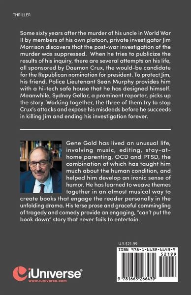 Some sixty years after the murder of his uncle in World War II by members of his own platoon, private investigator Jim Morrison discovers that the post-war investigation of the murder was suppressed. When he tries to publicize the results of his inquiry, there are several attempts on his life, all sponsored by Daemon Crux, the would-be candidate for the Republican nomination for president. To protect Jim, his friend, Police Lieutenant Sean Murphy provides him with a hi-tech safe house that he has designed himself. Meanwhile, Sydney Gellar, a prominent reporter, picks up the story. Working together, the three of them try to stop Crux's attacks and expose his misdeeds before he succeeds in killing Jim and ending his investigation forever.