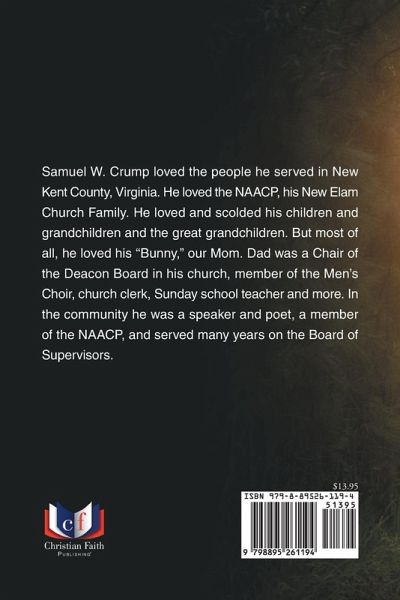 Samuel W. Crump loved the people he served in New Kent County, Virginia. He loved the NAACP, his New Elam Church Family. He loved and scolded his children and grandchildren and the great grandchildren. But most of all, he loved his "Bunny," our Mom. Dad was a Chair of the Deacon Board in his church, member of the Men's Choir, church clerk, Sunday school teacher and more. In the community he was a speaker and poet, a member of the NAACP, and served many years on the Board of Supervisors.