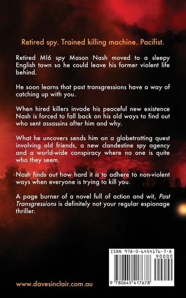 Retired spy. Trained killing machine. Pacifist.Retired MI6 spy Mason Nash moved to a sleepy English town so he could leave his former violent life behind.He soon learns that past transgressions have a way of catching up with you.When hired killers invade his peaceful new existence Nash is forced to fall back on his old ways to find out who sent assassins after him and why.What he uncovers sends him on a globetrotting quest involving old friends, a new clandestine spy agency and a world-wide conspiracy where no one is quite who they seem.Nash finds out how hard it is to adhere to non-violent ways when everyone is trying to kill you.A page burner of a novel full of action and wit, Past Transgressions is definitely not your regular espionage thriller.