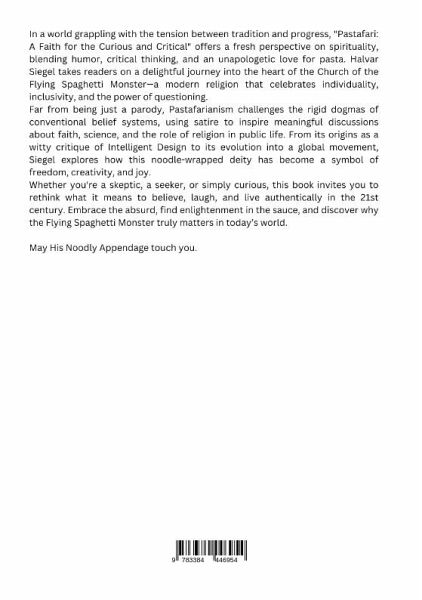 In a world grappling with the tension between tradition and progress, "Pastafari: A Faith for the Curious and Critical" offers a fresh perspective on spirituality, blending humor, critical thinking, and an unapologetic love for pasta. Halvar Siegel takes readers on a delightful journey into the heart of the Church of the Flying Spaghetti Monster-a modern religion that celebrates individuality, inclusivity, and the power of questioning.Far from being just a parody, Pastafarianism challenges the rigid dogmas of conventional belief systems, using satire to inspire meaningful discussions about faith, science, and the role of religion in public life. From its origins as a witty critique of Intelligent Design to its evolution into a global movement, Siegel explores how this noodle-wrapped deity has become a symbol of freedom, creativity, and joy.Whether you're a skeptic, a seeker, or simply curious, this book invites you to rethink what it means to believe, laugh, and live authentically in the 21st century. Embrace the absurd, find enlightenment in the sauce, and discover why the Flying Spaghetti Monster truly matters in today's world.